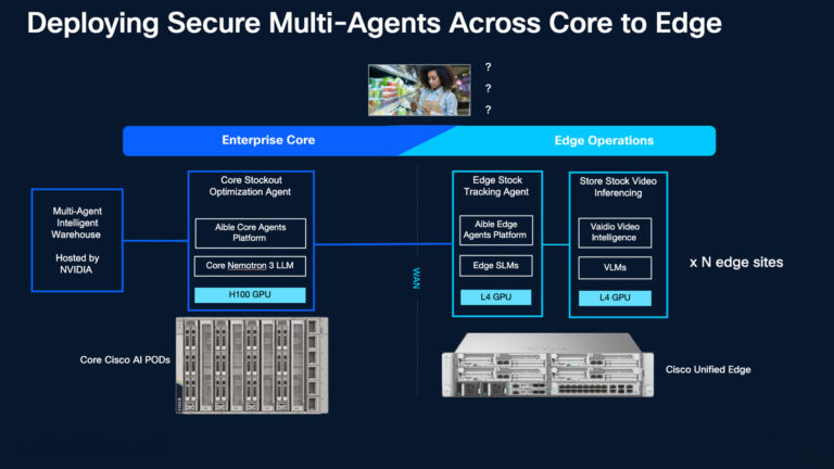 - Vaidio (the eyes): Operating on Cisco Unified Edge nodes (3-4 nodes per web site), Vaidio pc imaginative and prescient containers make the most of NVIDIA L4 GPUs to observe the ground for stockouts or security hazards.